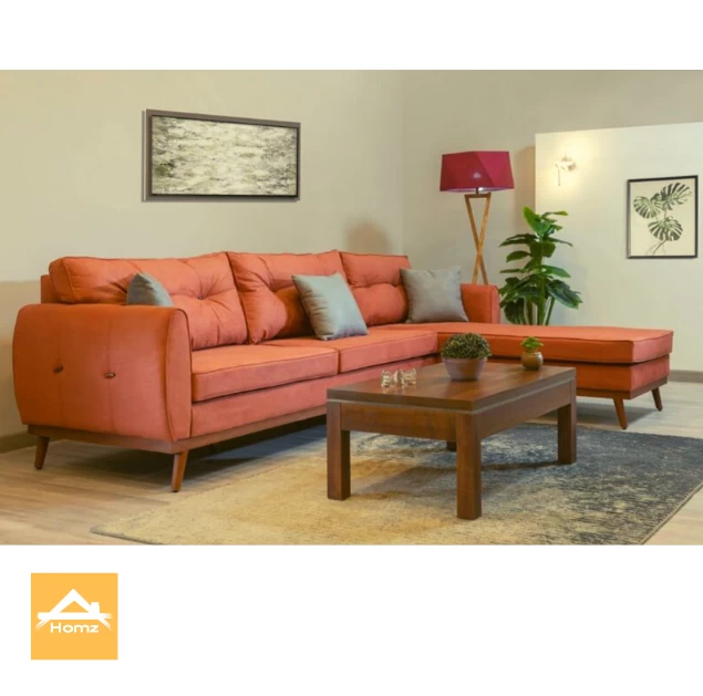 Elegant and Comfortable Design: This beige corner sofa combines functionality and style, featuring a sleek design that fits perfectly into any living space. The sturdy frame is made of beech wood, and the brown legs provide a warm touch to the overall look.