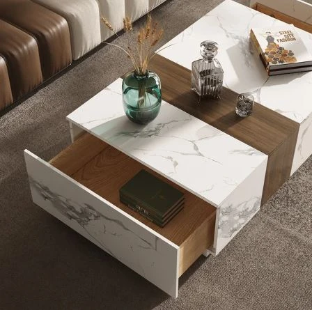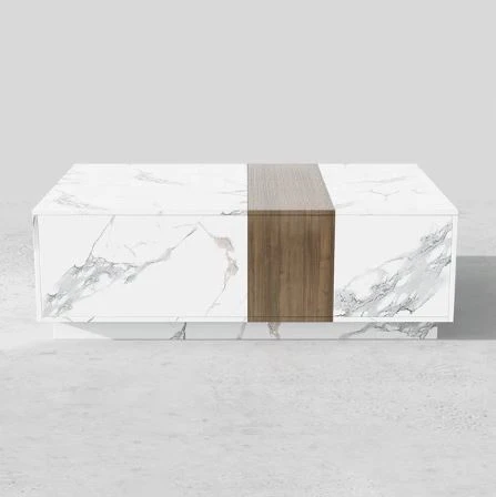 A modern and elegant coffee table that perfectly blends style and functionality. The tabletop features a luxurious texture and design that mimics Carrara marble, giving it a refined and contemporary look. It also includes a separate decorative wooden piece in a warm brown tone, which can be moved around to create a dynamic and personalized arrangement.