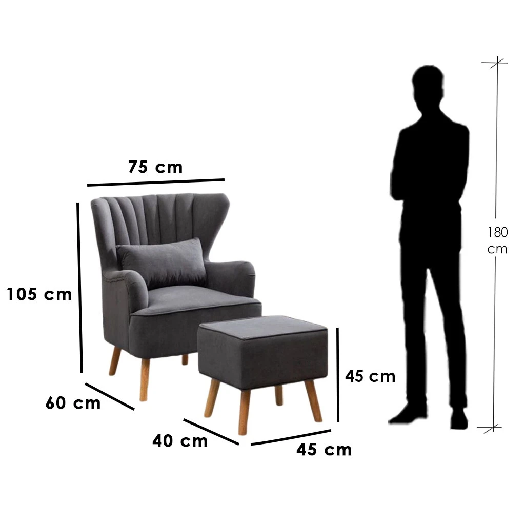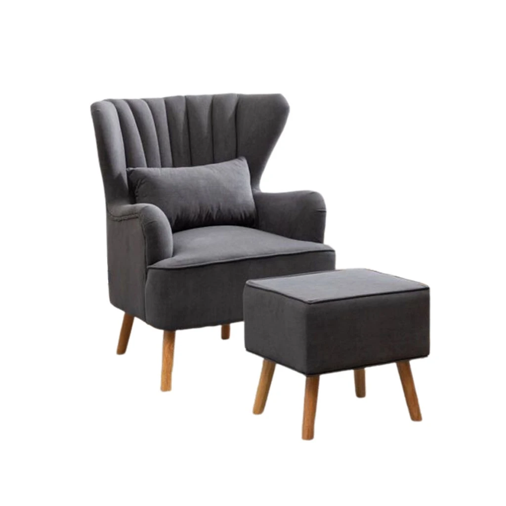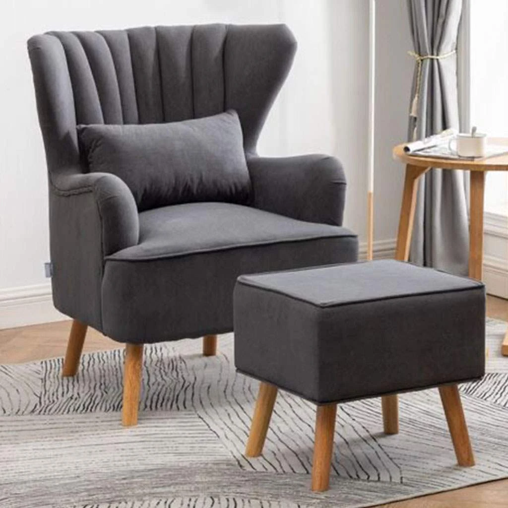 Luxurious and Comfortable Design: A gray chair with matching ottoman featuring a modern style and soft velvet fabric for a touch of elegance and coziness.