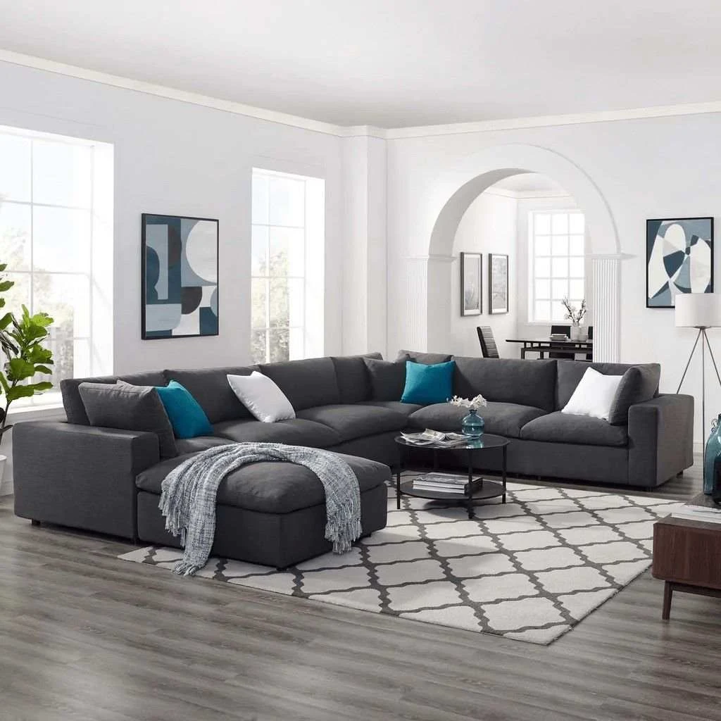 Upgrade your living room with this U-shaped grey sofa set, designed for style and comfort. Featuring two main sofas and a separate ottoman, this versatile piece can be arranged to fit various spaces and layouts