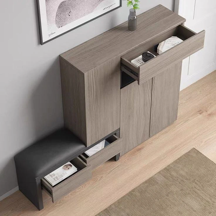 A modern shoe cabinet with a padded seat that combines comfort with functionality. This stylish cabinet features a premium leather-upholstered seat for extra comfort when putting on or taking off shoes, along with a handleless touch-opening system for a sleek, elegant look and effortless usability.