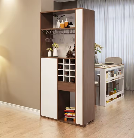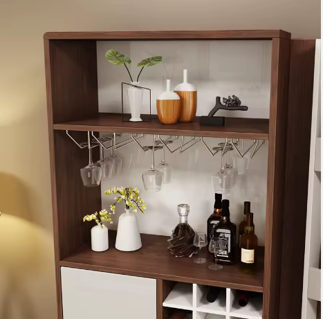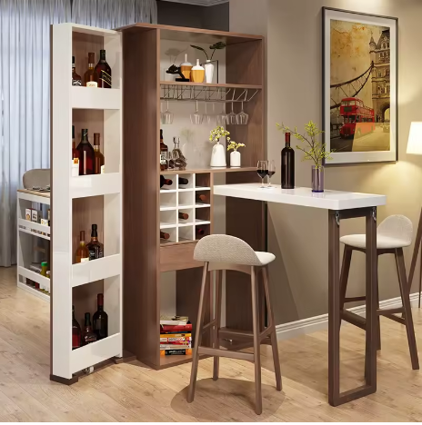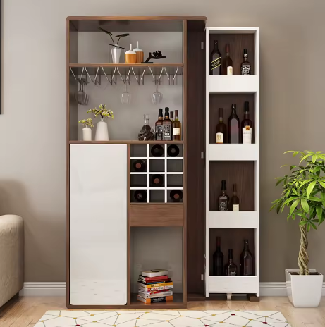 خزانة بار عصرية باللون الأبيض والبني، تجمع بين التصميم العملي والمظهر الأنيق. تتميز بخاصية التمديد لتوفير مساحة إضافية عند الحاجة، مع تصميم متعدد الطبقات يتيح لك تخزين الزجاجات والأكواب بشكل مرتب ومنظم. قطعة مثالية لإضافة لمسة من الفخامة والعملية لغرفة المعيشة أو ركن الطعام.