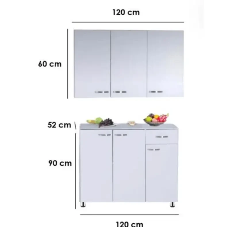MDF or particle board kitchen in white with melamine layer, consisting of upper and lower units with shelves for organized and practical storage. Ideal for any kitchen design, providing efficient organization and easy access to essentials.