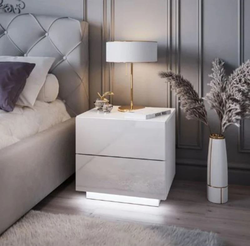 A modern nightstand that blends simplicity and elegance, designed to fit small spaces while adding a contemporary touch to any bedroom or living area. Features built-in LED lighting for both style and function.