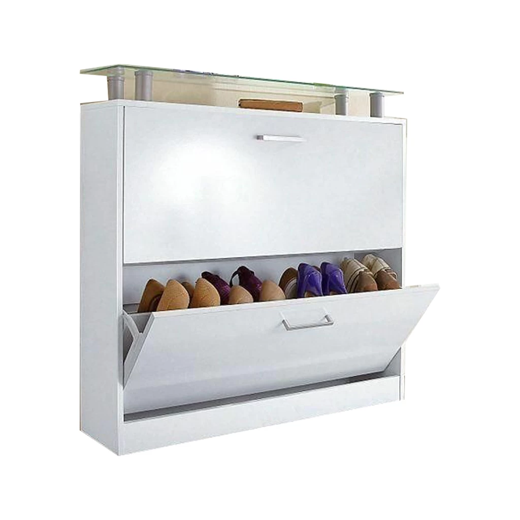 Practical and Space-Saving Design: A stylish shoe cabinet made of durable counter wood, featuring two flip-down drawers, each containing 3 internal shelves to give you perfect shoe organization. It can hold between 27 to 30 pairs of shoes, making it an ideal choice for entryways or bedrooms with limited space.