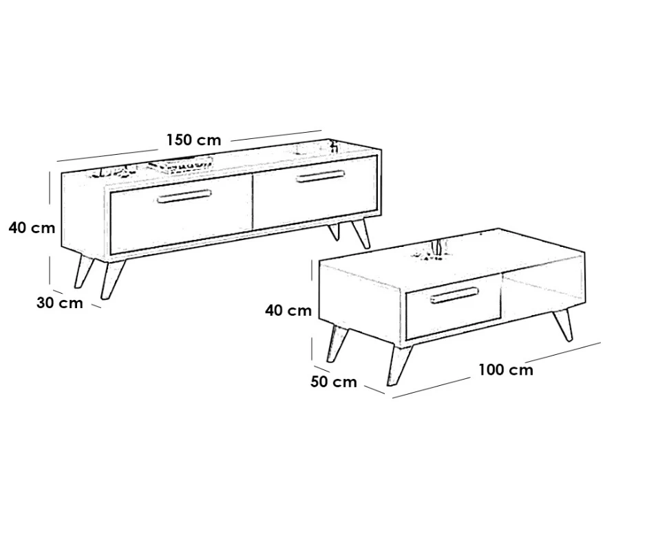 A modern and elegant TV unit and coffee table set that combines beige and gray colors with black accents on the legs, adding a unique touch of harmony and sophistication to any space. The set is made from high-quality wood imported from the European Union, offering both attractive appearance and long-lasting durability. The design strikes a perfect balance between beauty and functionality, featuring smart storage units that make organizing and arranging your space effortless.