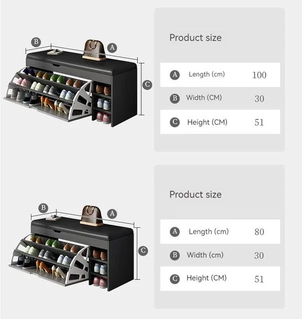 A practical and modern shoe cabinet designed in brown with a comfortable seat covered in high-quality black leather. It features a tilt door with three shelves for storage, along with an open storage space that includes three additional shelves for organizing shoes and daily items with ease.