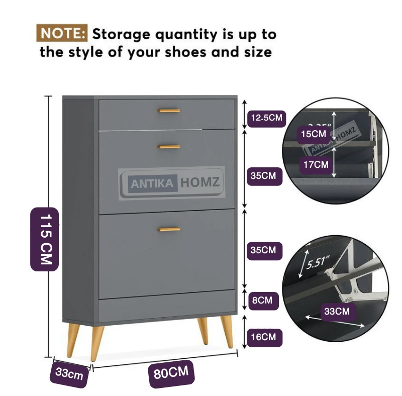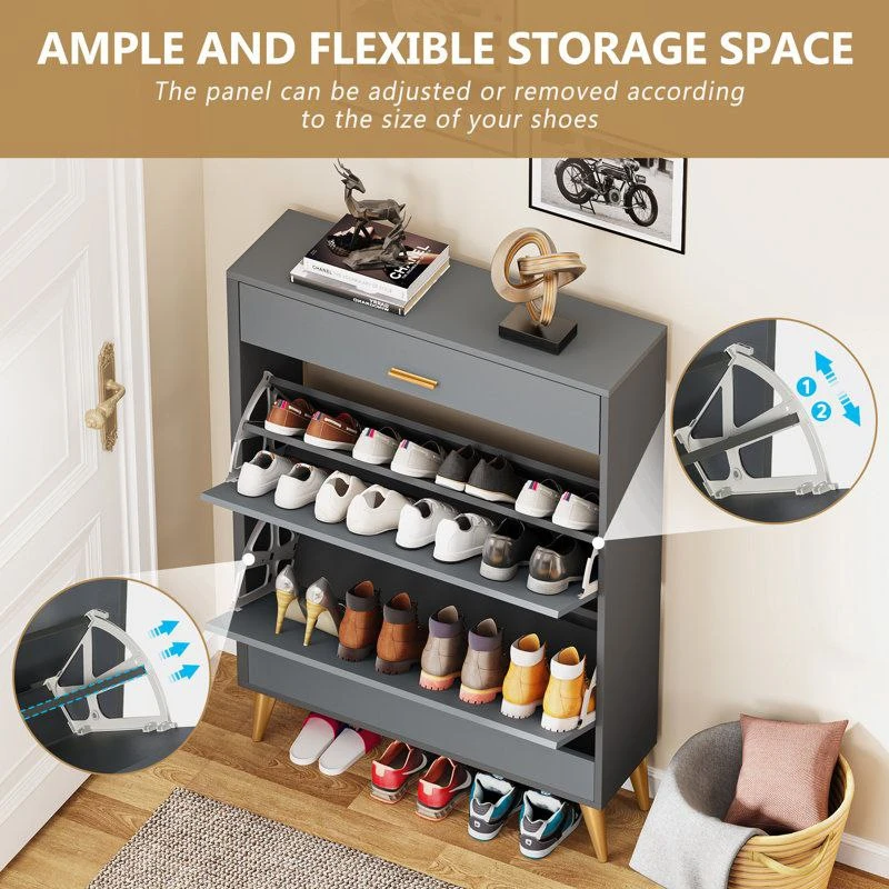 Elegant and Modern Design: A uniquely designed shoe cabinet in a stylish gray color with brown beech wood legs, adding warmth and sophistication to any home décor.