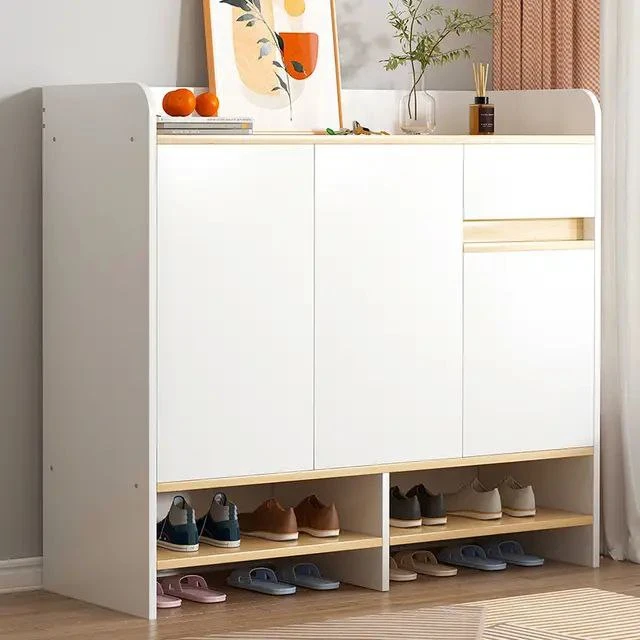 A modern shoe cabinet in white and beige, featuring a contemporary design that blends elegance and practicality—an ideal addition for organizing shoes and various household items.
