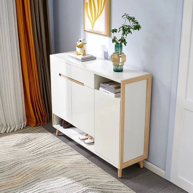 A carefully designed multi-functional shoe cabinet in white and beige, offering practical storage with a modern, elegant touch to your home.