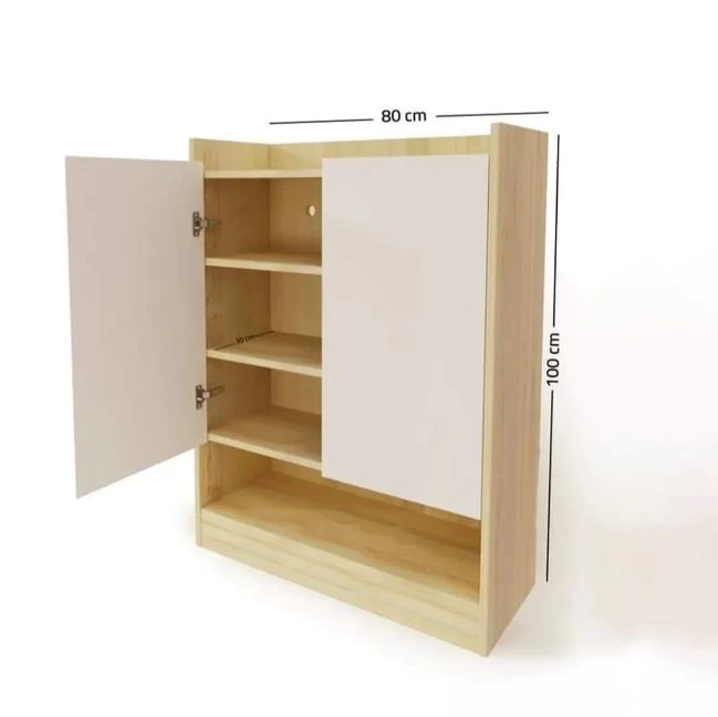 A shoe cabinet that combines modern design with high quality, featuring a stylish white and beige color scheme to complement various interior decors. It includes 2 doors and 3 internal shelves, offering 3 practical storage compartments, along with an open bottom shelf for easy access. An ideal solution for organizing entryways, bedrooms, or any indoor space—no assembly required.