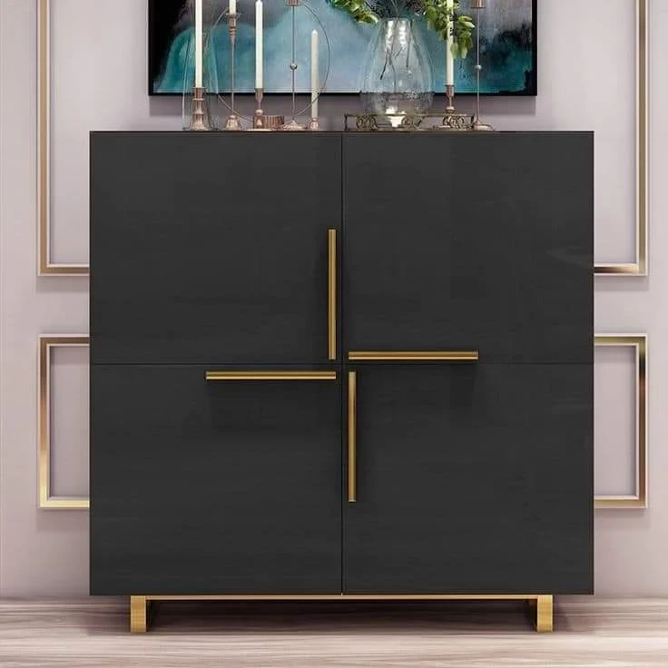 A sleek black shoe cabinet that adds a refined touch to any space—perfect for modern entryways or storage rooms. Features gold-colored handles and legs for a luxurious look that blends seamlessly with various décor styles.