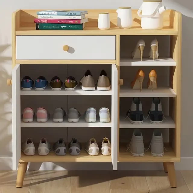 An elegant and practical shoe cabinet in white and beige, featuring natural beech wood legs and button handles, adding a touch of beauty and comfort to any interior space. It offers versatile storage with two doors containing four internal shelves, a drawer, and an open storage area with four shelves, making it easy to organize your shoes and personal items.