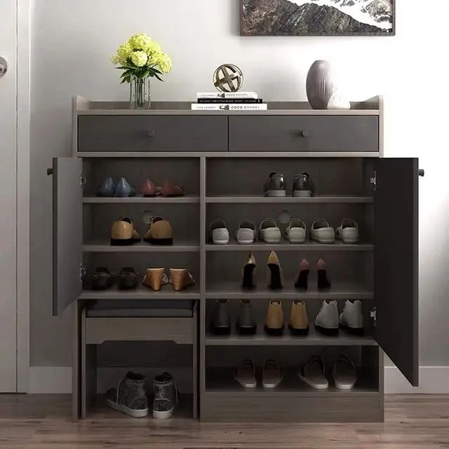A modern shoe cabinet combining beige and gray colors for an elegant look that fits various interiors. Equipped with a luxurious and comfortable leather seat to make putting on shoes easier, making it a perfect piece combining beauty and function.