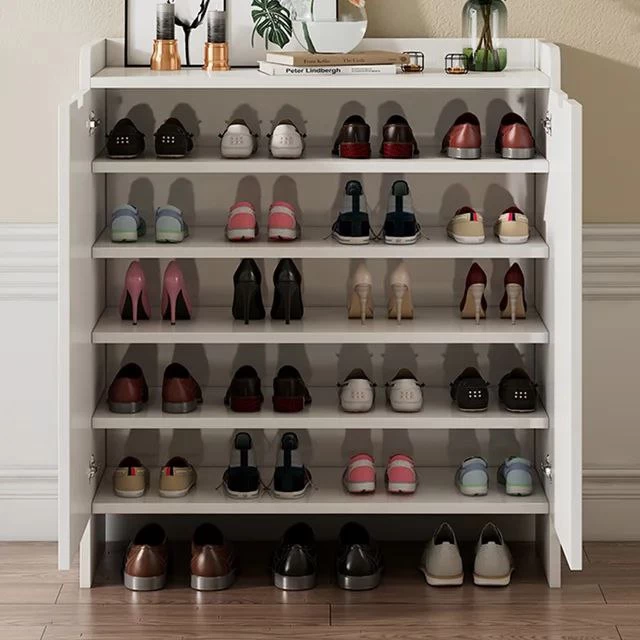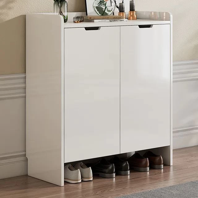 Modern White Shoe Cabinet with Integrated Handles. A practical and elegant shoe cabinet in white, designed to fit seamlessly into any space. It features integrated handles within the body for a sleek and streamlined look.