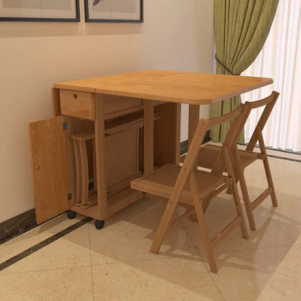Folding Dining Set – 4 Chairs with Wheels & Natural Beech Wood Table