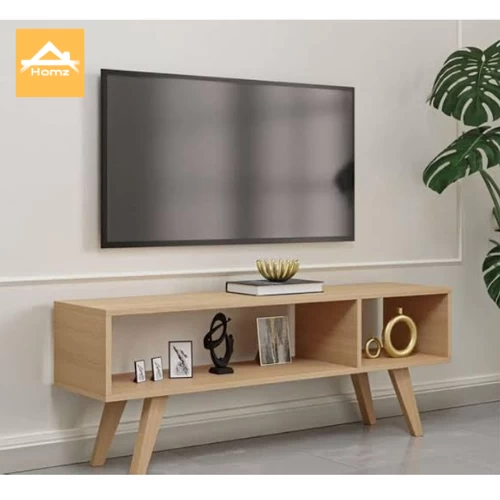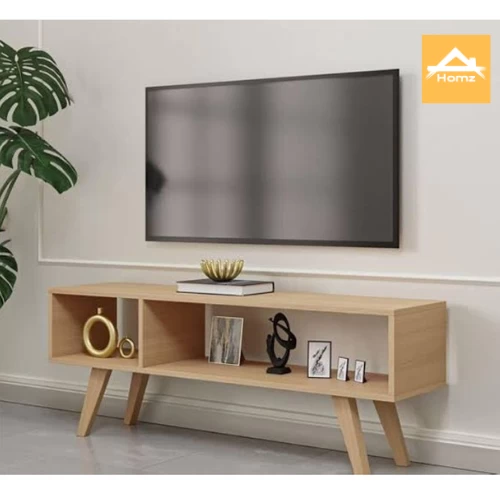 This beige TV stand with sturdy red beech wood legs offers a perfect balance of style and practicality, making it a reliable and elegant addition to your living space.