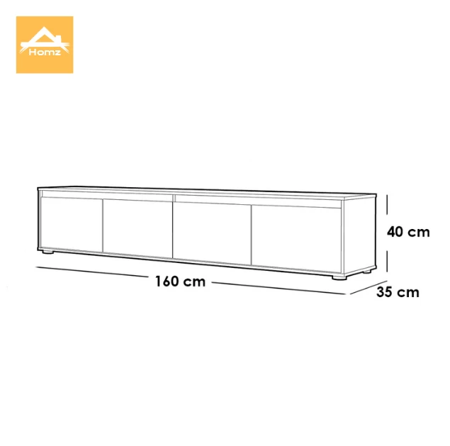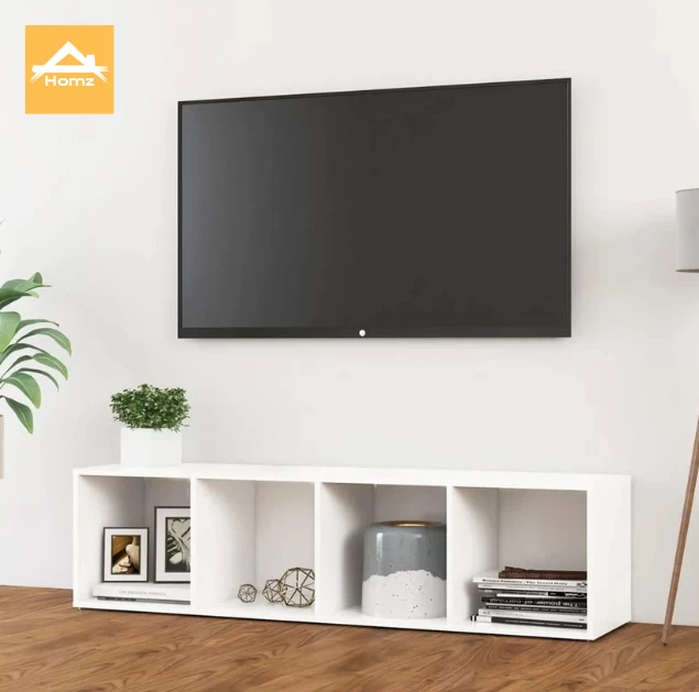 Simple and practical TV stand with four open storage compartments, ideal for any modern living room.
