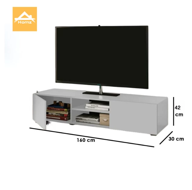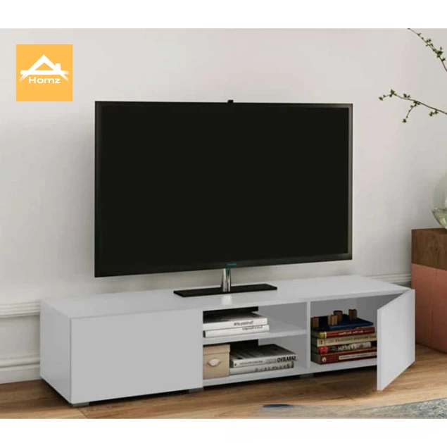 Modern & Minimalist Design: This TV stand features a clean, white finish that complements any interior décor. With two closed cabinets and an open storage space, it offers a stylish and functional solution for organizing electronics and decorative items.