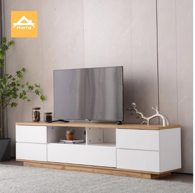 Sleek modern TV table with four drawers and a split open display section—smart organization for devices and accessories.