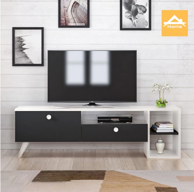 Versatile modern layout: one drawer, a flip-down door, and three open compartments to keep devices and accessories tidy.