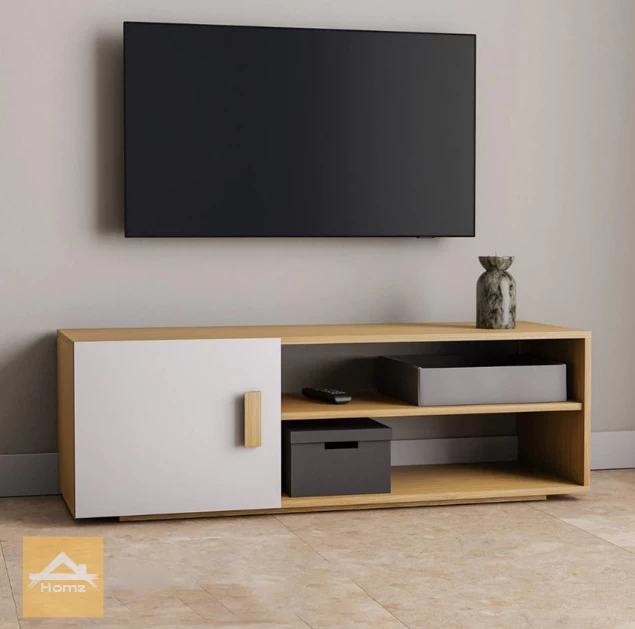 Elegant and balanced design: This TV stand comes in white and beige colors, adding a touch of elegance and warmth to any living room. It includes one door with an internal shelf, along with an open space comprising two shelves for displaying décor or storing electronic devices.