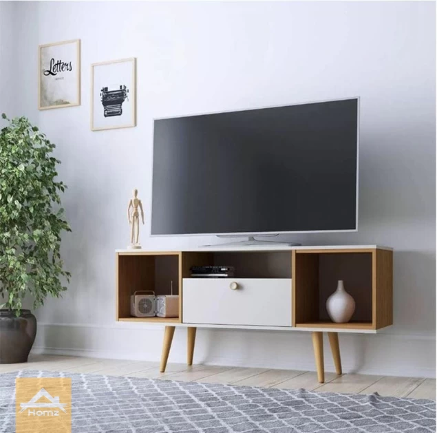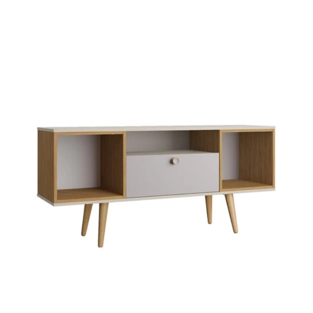 Elegant and practical TV stand with a closed drawer, open storage compartments, and sturdy wooden legs, perfect for any modern living room.