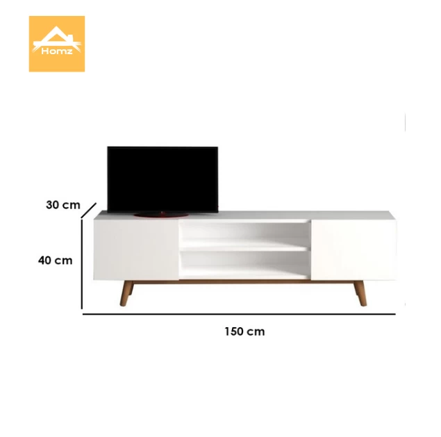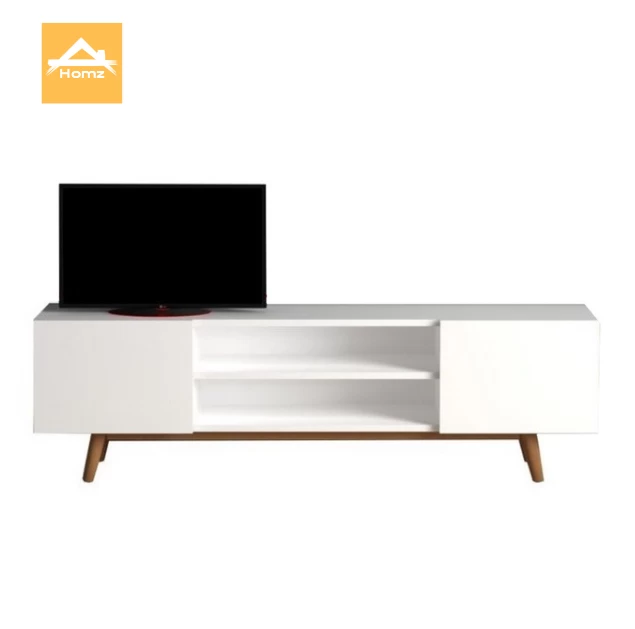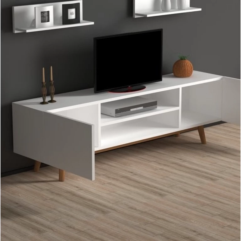Modern and minimalist TV stand with two side cabinets and open center compartments for practical storage and stylish display.