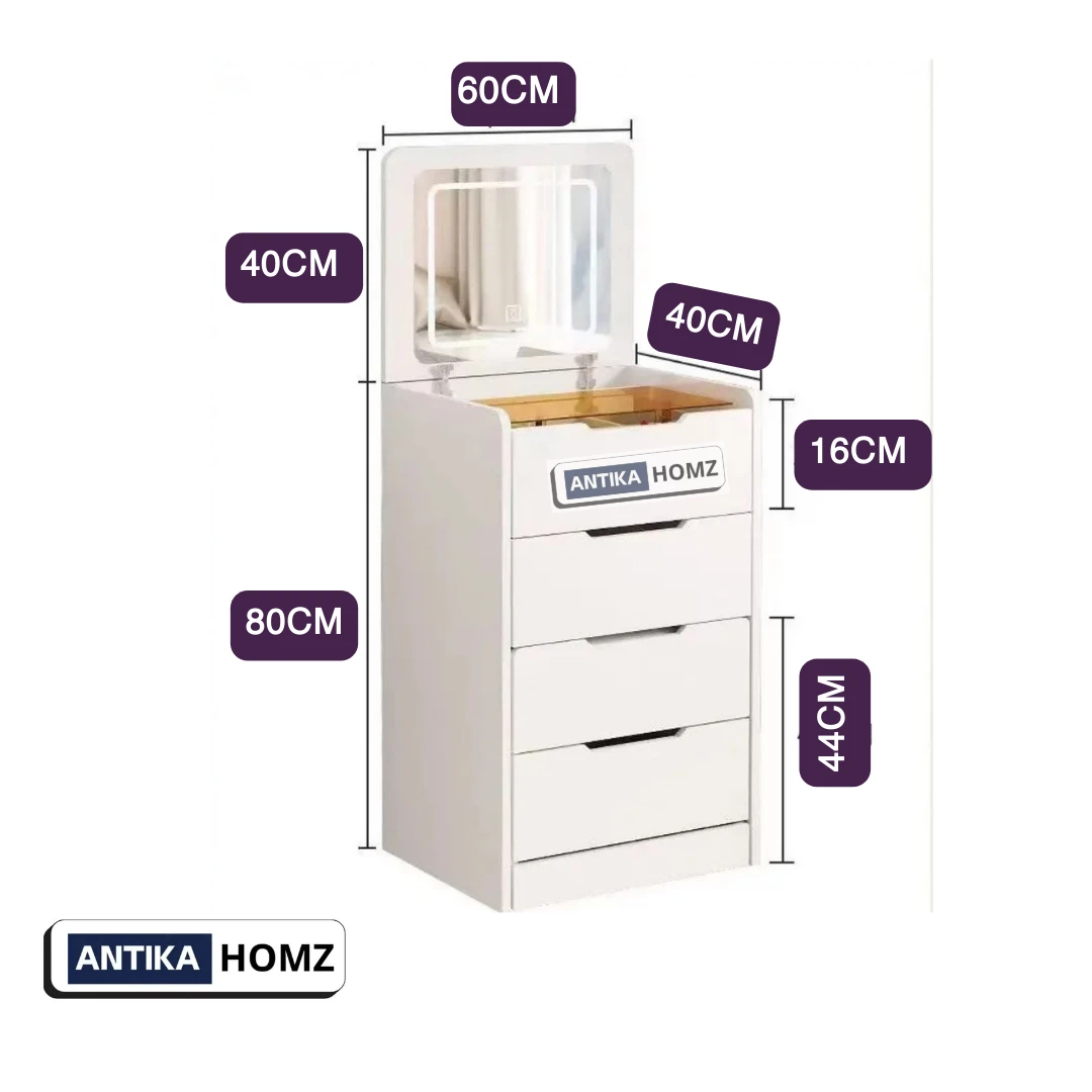 A multifunctional white vanity with a modern and practical design that combines elegance and functionality.
