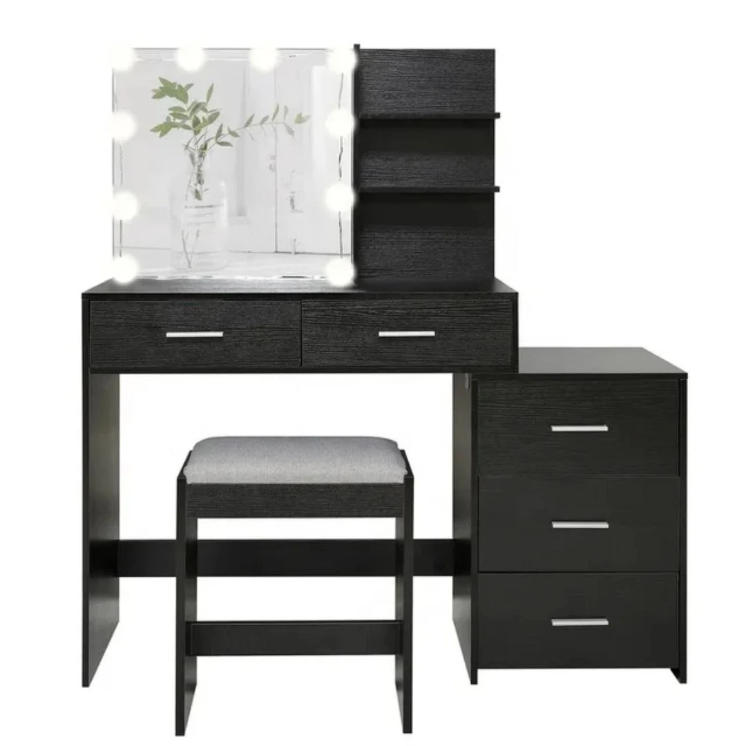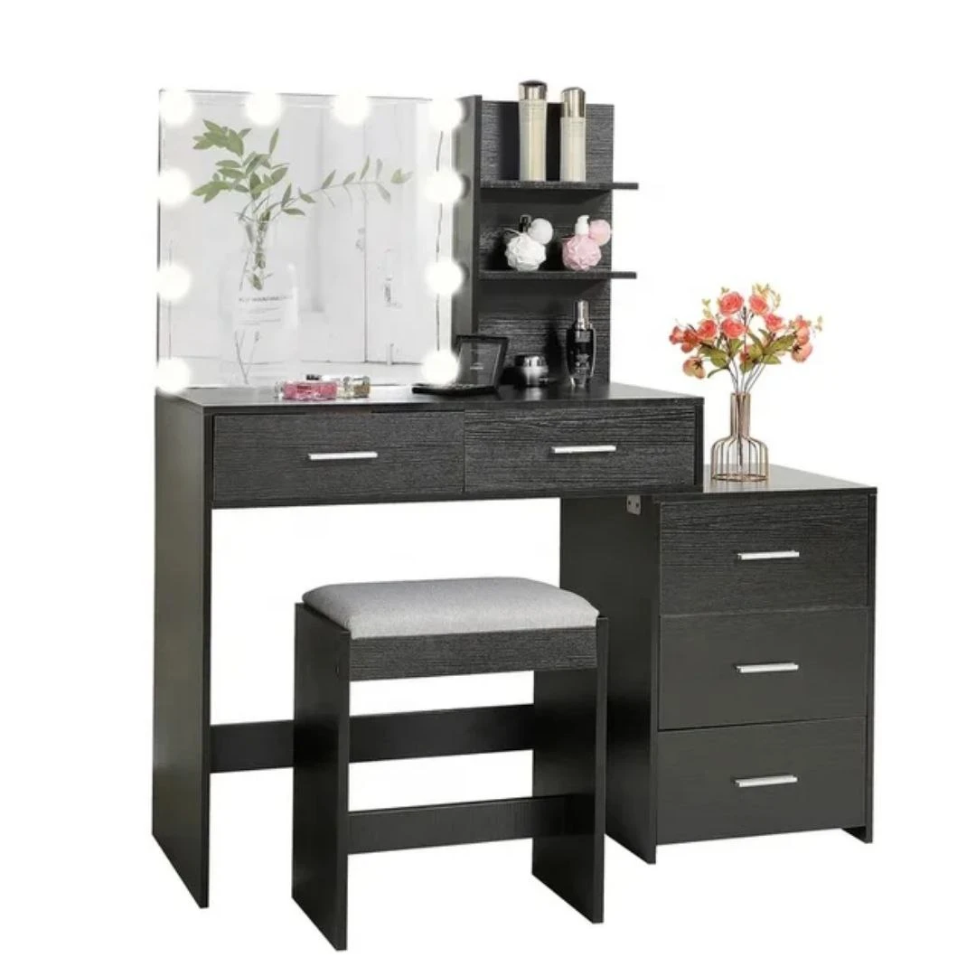 Vanity available in white or black (each color is an independent option), equipped with illuminated mirrors and a comfortable seat, adding a touch of elegance and practicality to your bedroom.