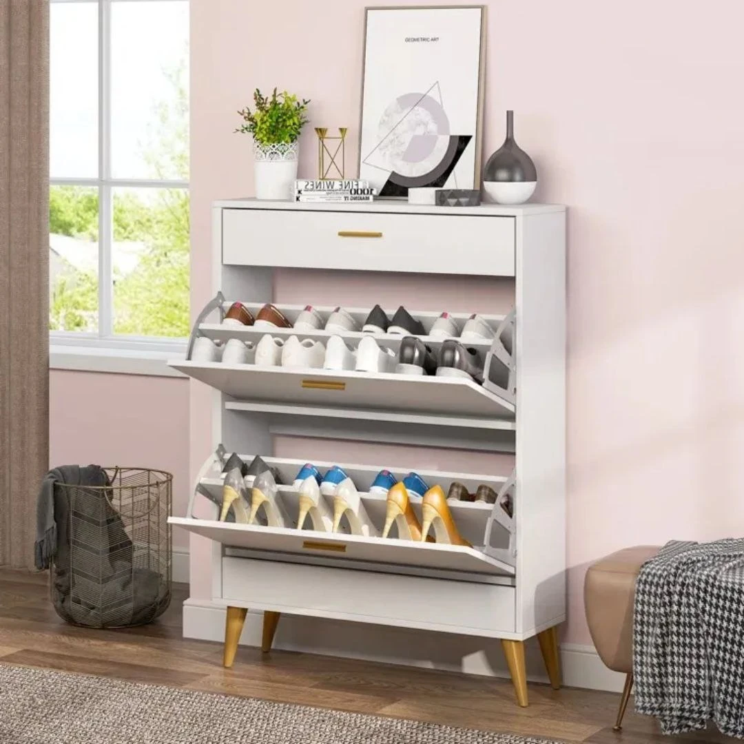 A stylish white shoe cabinet with a practical design that blends simplicity and elegance—perfect for organizing shoes and adding a refined touch to entryways or storage rooms. It features a top drawer for daily essentials, in addition to two flip-down doors, each with two internal shelves to provide maximum storage capacity.