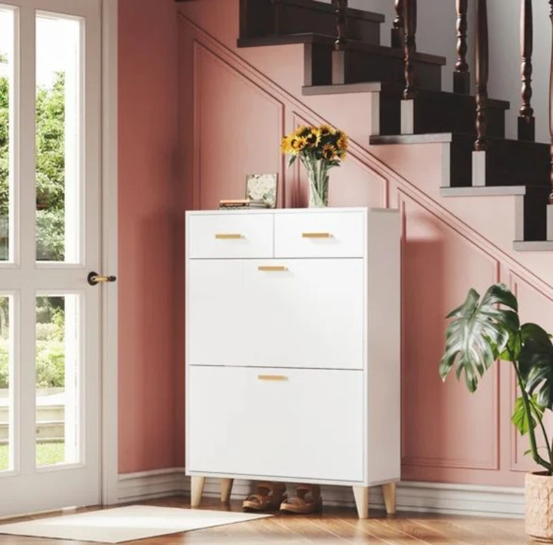 Modern and Stylish Design: A shoe cabinet in white with beige legs and handles, combining simplicity and beauty for your home. Practical and Flexible Storage: Features two flip doors, each with two shelves, holding 14–16 pairs of shoes in an organized way. Additional Storage: Includes two top drawers for small items or decorative touches.